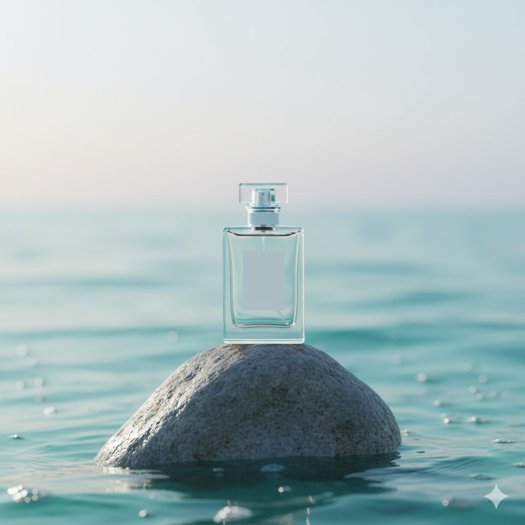 Prompt: “Ένα μπουκάλι αρώματος πάνω σε έναν λείο βράχο στη μέση της θάλασσας, απαλό πρωινό φως, μινιμαλιστική αισθητική, macro φωτογραφία, βάθος πεδίου (bokeh).”