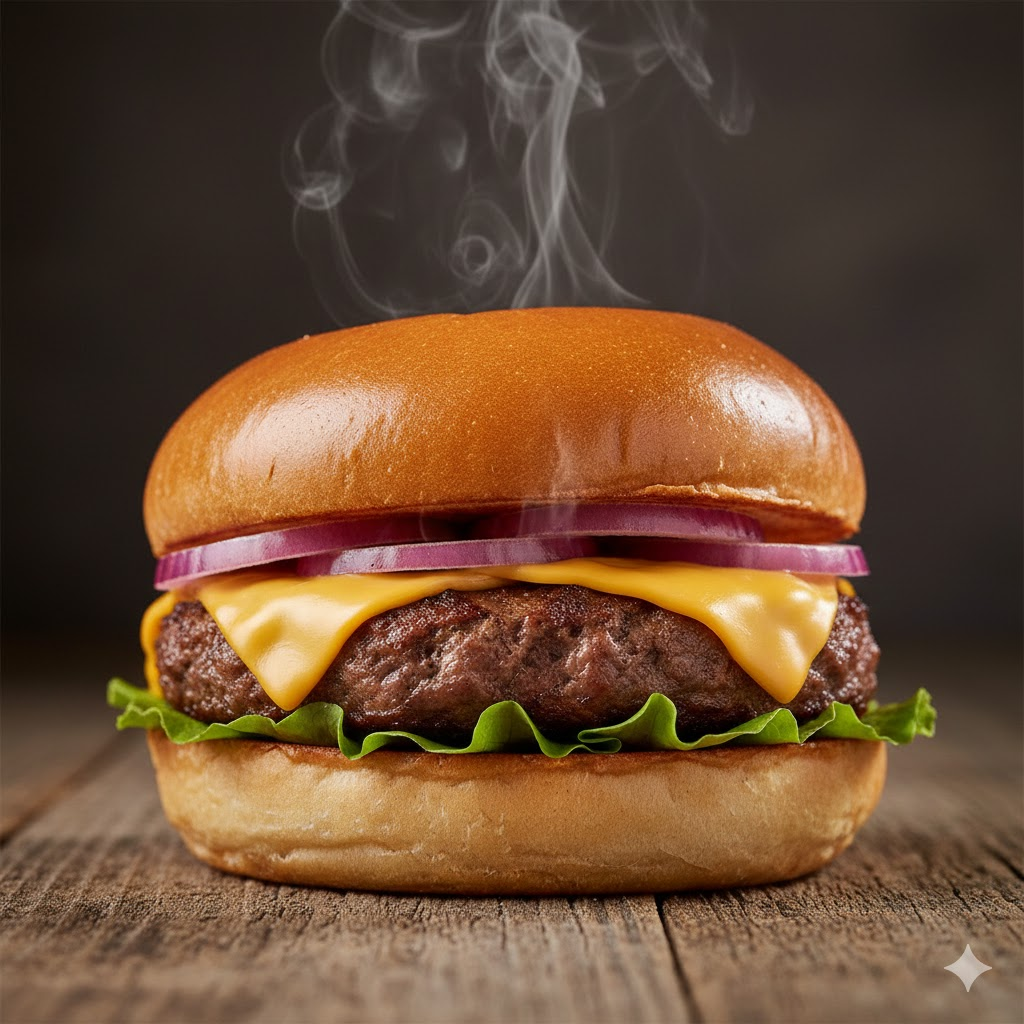Prompt: “Επαγγελματική φωτογραφία ενός burger με λιωμένο τυρί, ατμός να βγαίνει από το κρέας, ξύλινο φόντο rustic, έντονα χρώματα, φωτισμός στούντιο.”