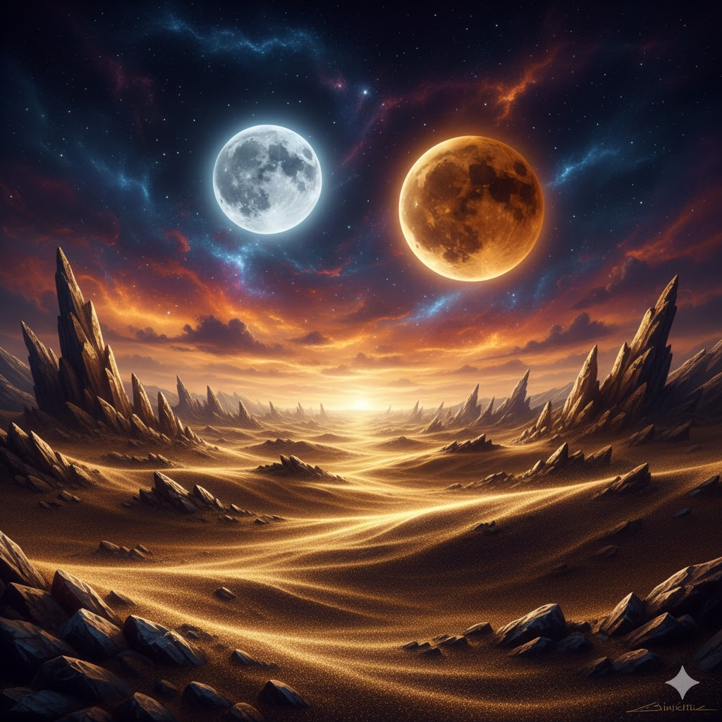 Prompt: “Μια έρημος όπου η άμμος είναι φτιαγμένη από χρυσόσκονη και ο ουρανός έχει δύο φεγγάρια, στυλ ψηφιακής τέχνης, ονειρική ατμόσφαιρα, έντονη αντίθεση.”