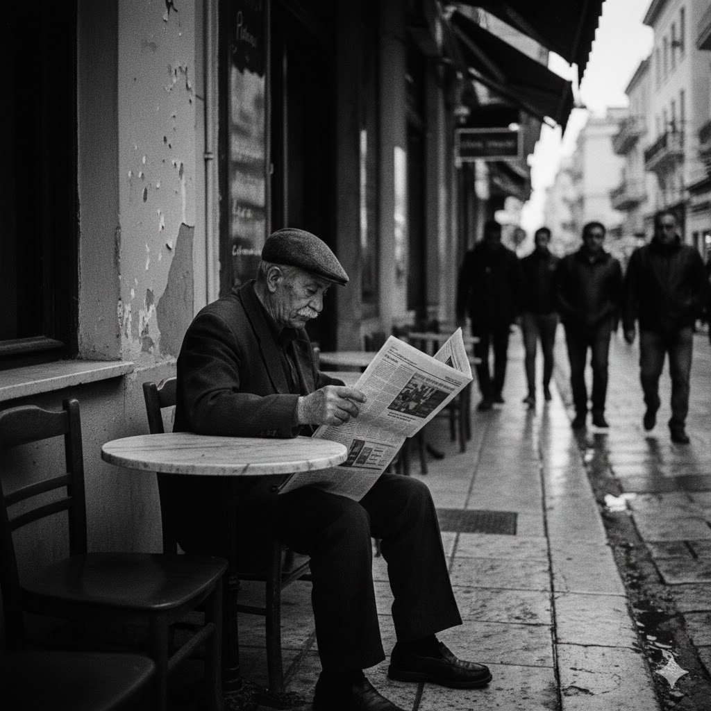 Prompt: “Ασπρόμαυρη φωτογραφία δρόμου στην Αθήνα, ένας ηλικιωμένος που διαβάζει εφημερίδα σε ένα παραδοσιακό καφενείο, έντονες σκιές (film noir style), κόκκος φιλμ 35mm.”