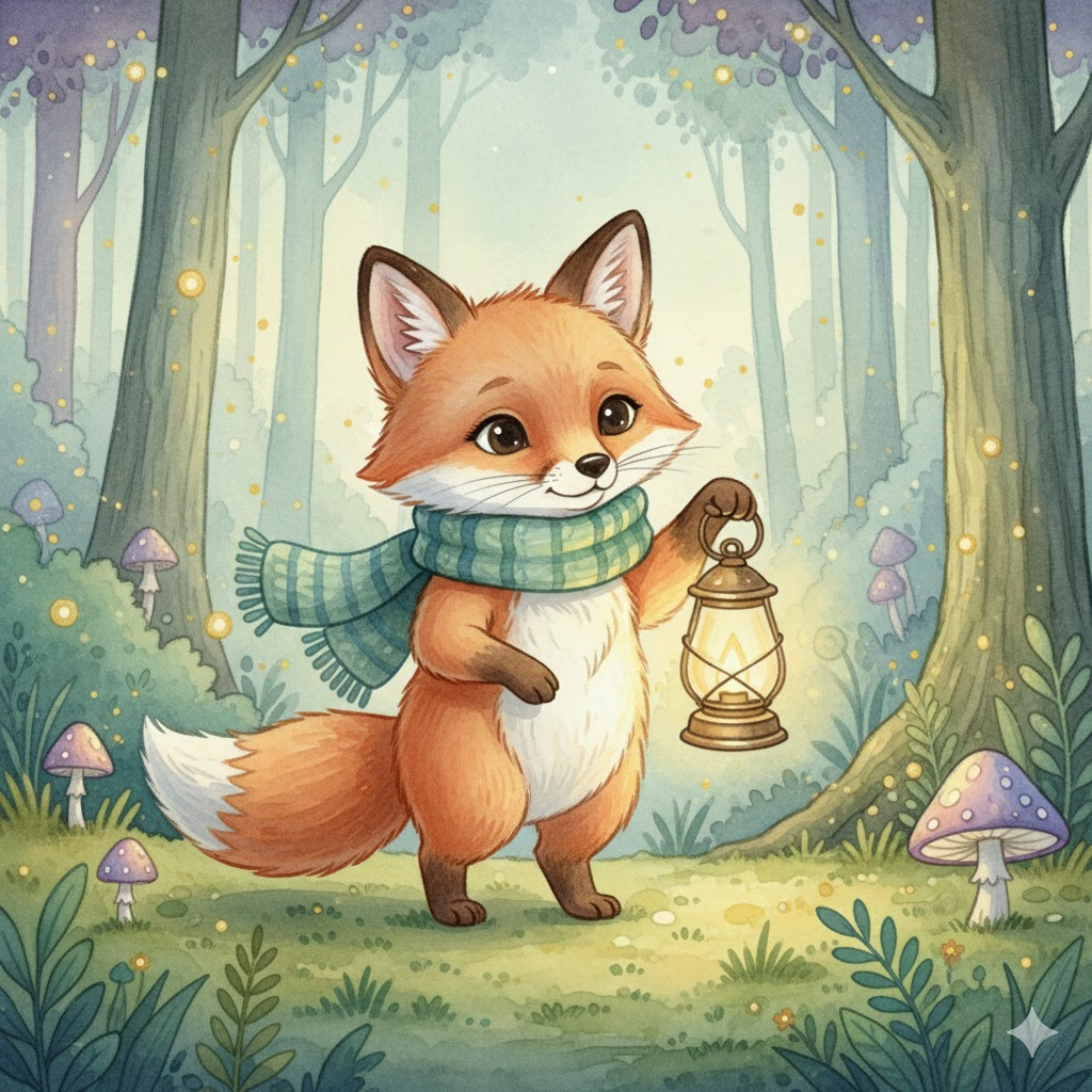 Prompt: “Μια χαριτωμένη αλεπού που φοράει κασκόλ και κρατάει ένα φανάρι στο δάσος, στυλ watercolor (νερομπογιά), παστέλ χρώματα, μαγική ατμόσφαιρα.”