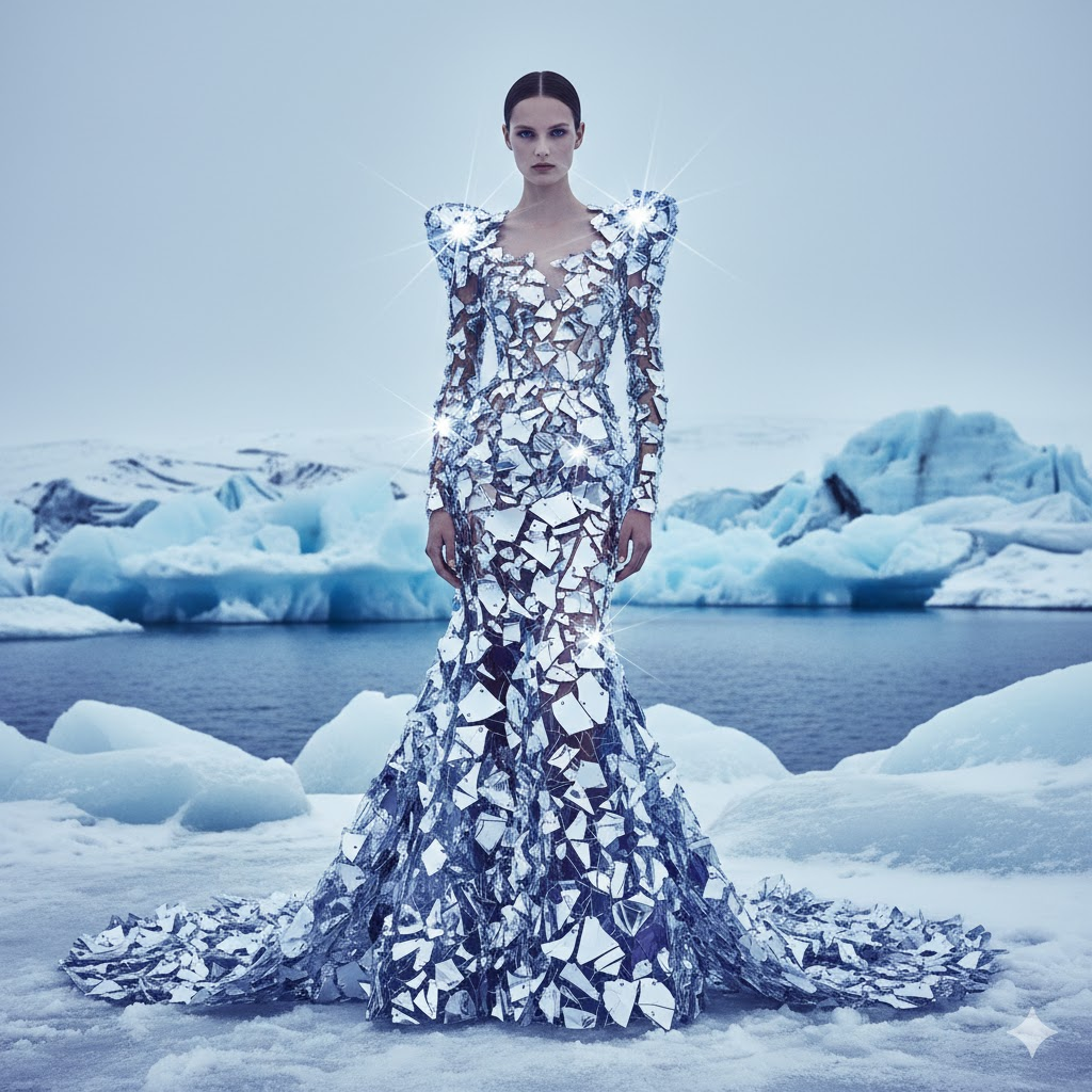 Prompt: “Μοντέλο που φοράει ένα φόρεμα από ανακυκλωμένο γυαλί, στέκεται σε ένα παγωμένο τοπίο, high fashion editorial, ψυχρά χρώματα, κρυστάλλινες λεπτομέρειες.”