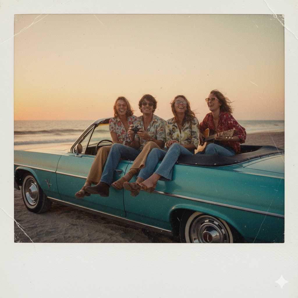 Prompt: “Μια παρέα νέων σε ένα vintage κάμπριο αυτοκίνητο στην παραλία, αισθητική Polaroid, ξεθωριασμένα χρώματα, ηλιοβασίλεμα, retro vibes.”