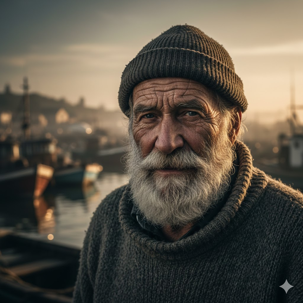 Prompt: “Κοντινό πορτρέτο ενός ηλικιωμένου ψαρά με έντονες ρυτίδες, κινηματογραφικός φωτισμός (rim lighting), φόντο ένα θολό λιμάνι το σούρουπο, υψηλή ευκρίνεια, στυλ National Geographic.”